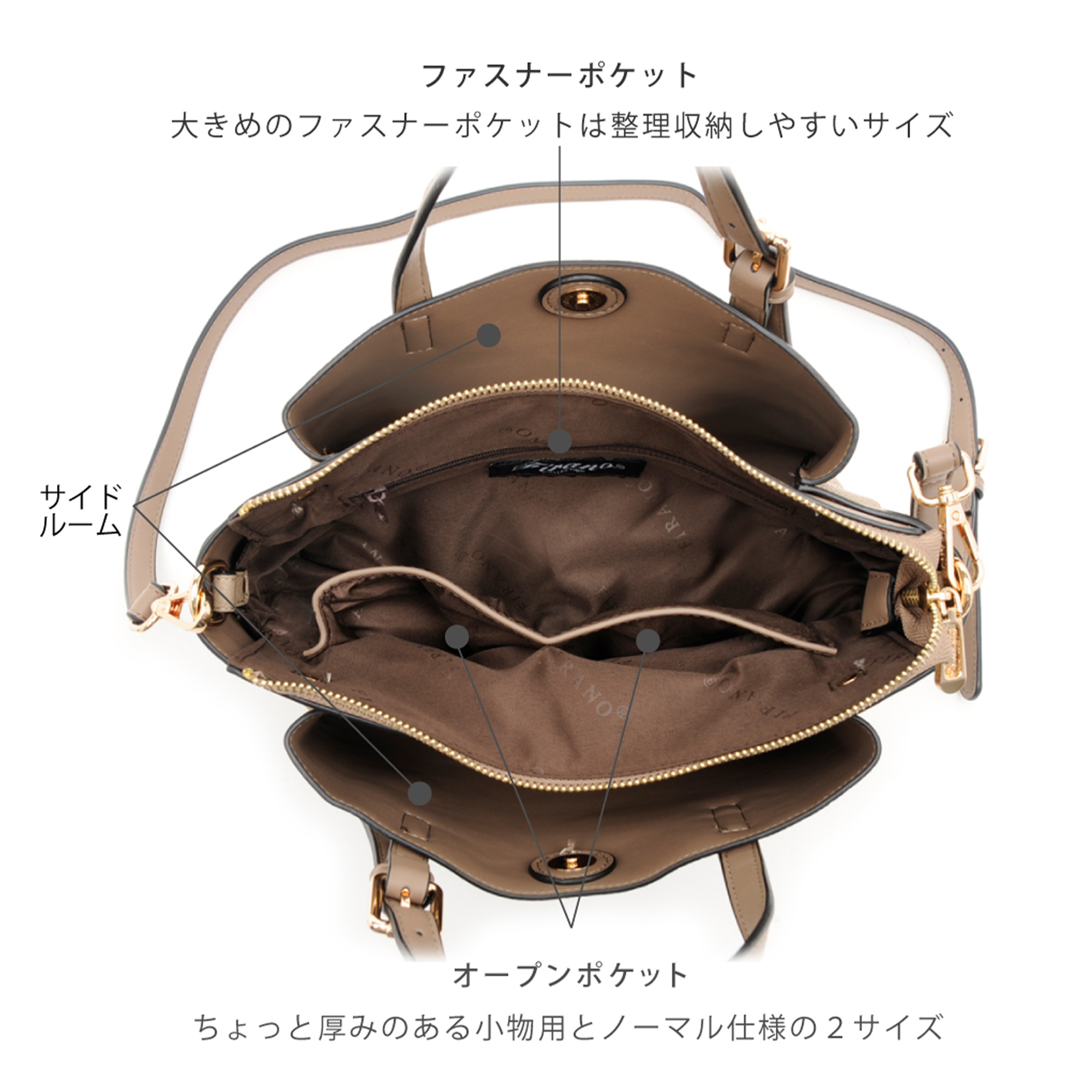 ■ 內部口袋:開放 x 2(正面)、拉鍊 x 1(背面)