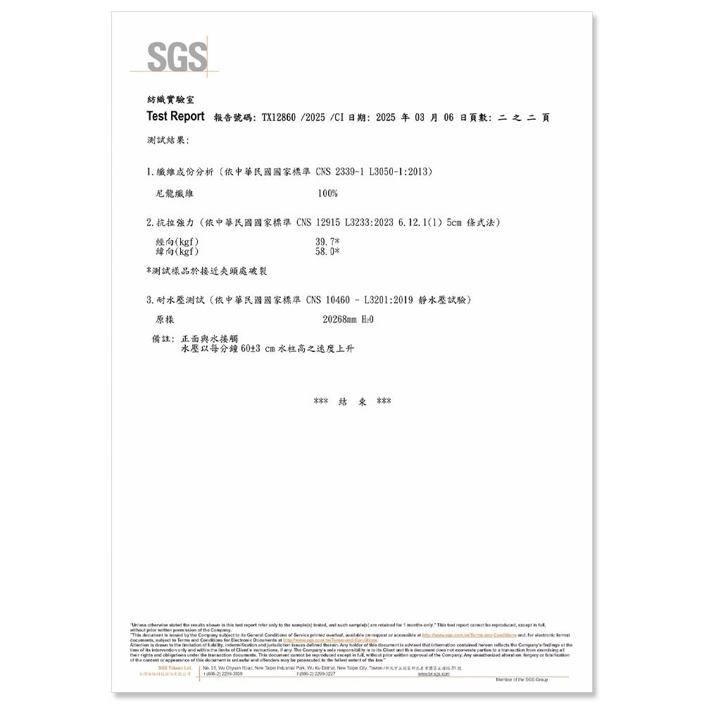 功效係數: SGS認證耐水壓20000mm2+防潑水