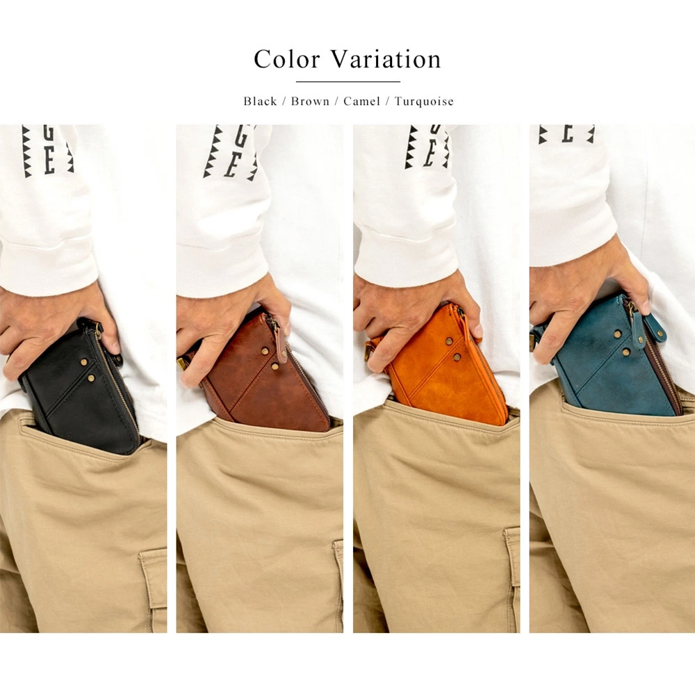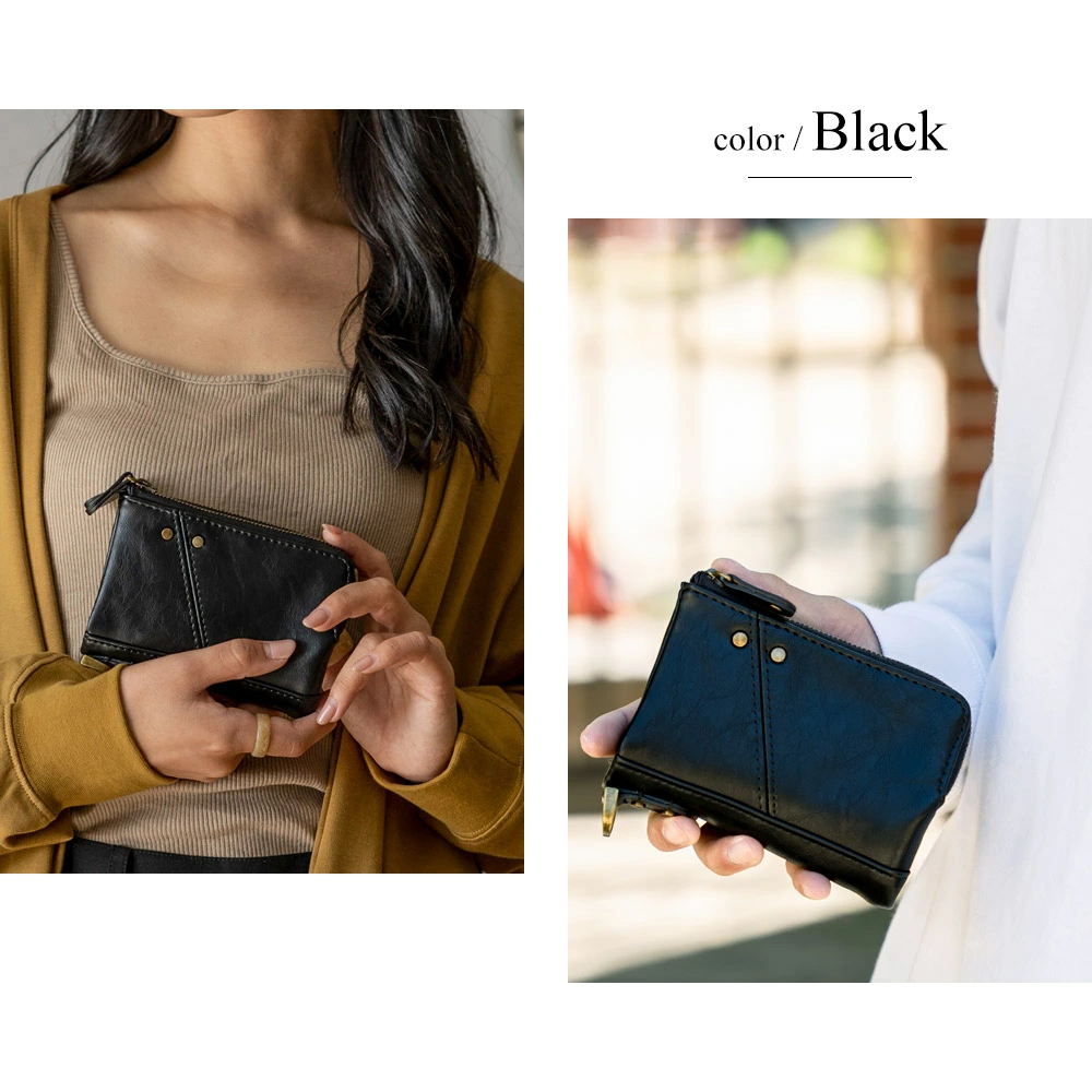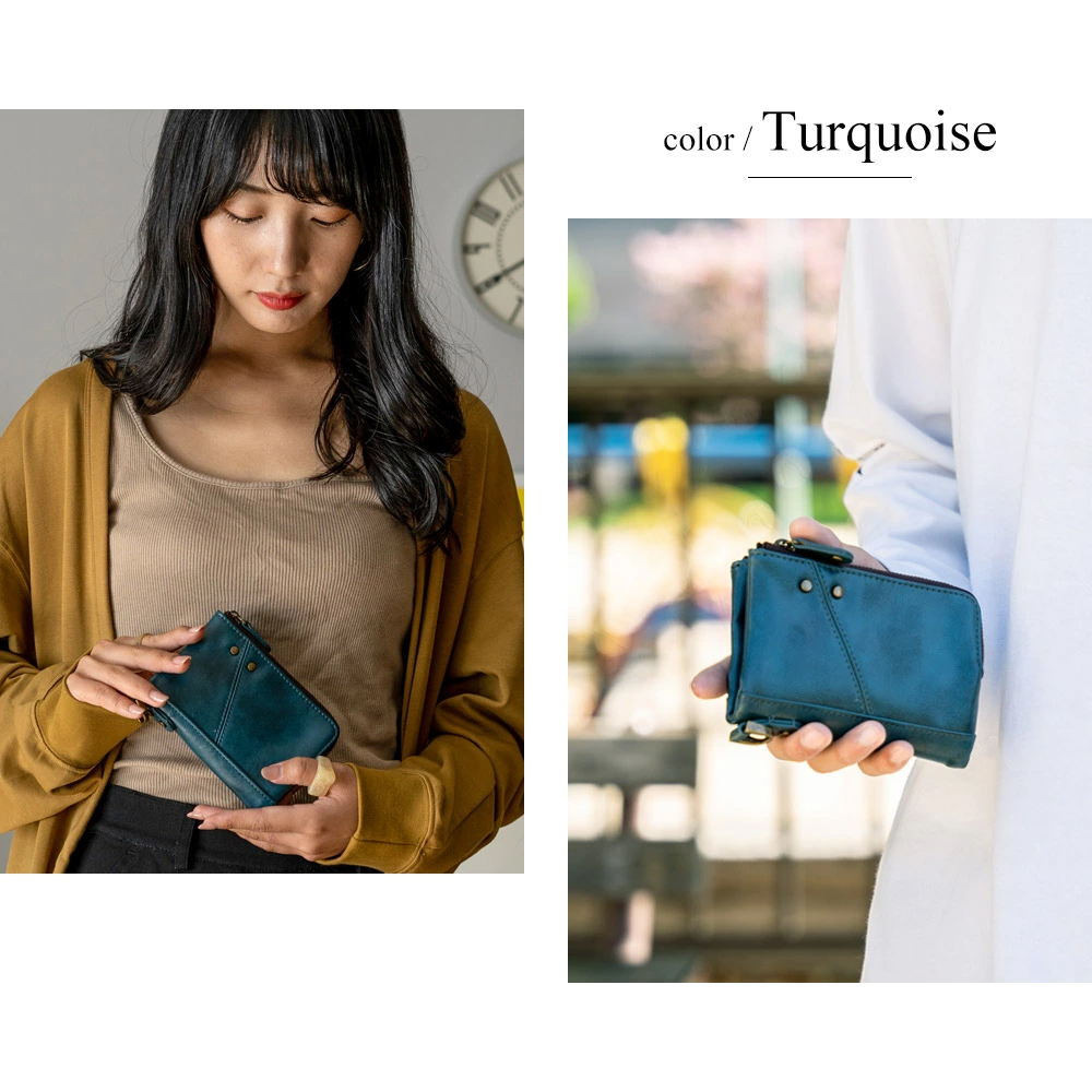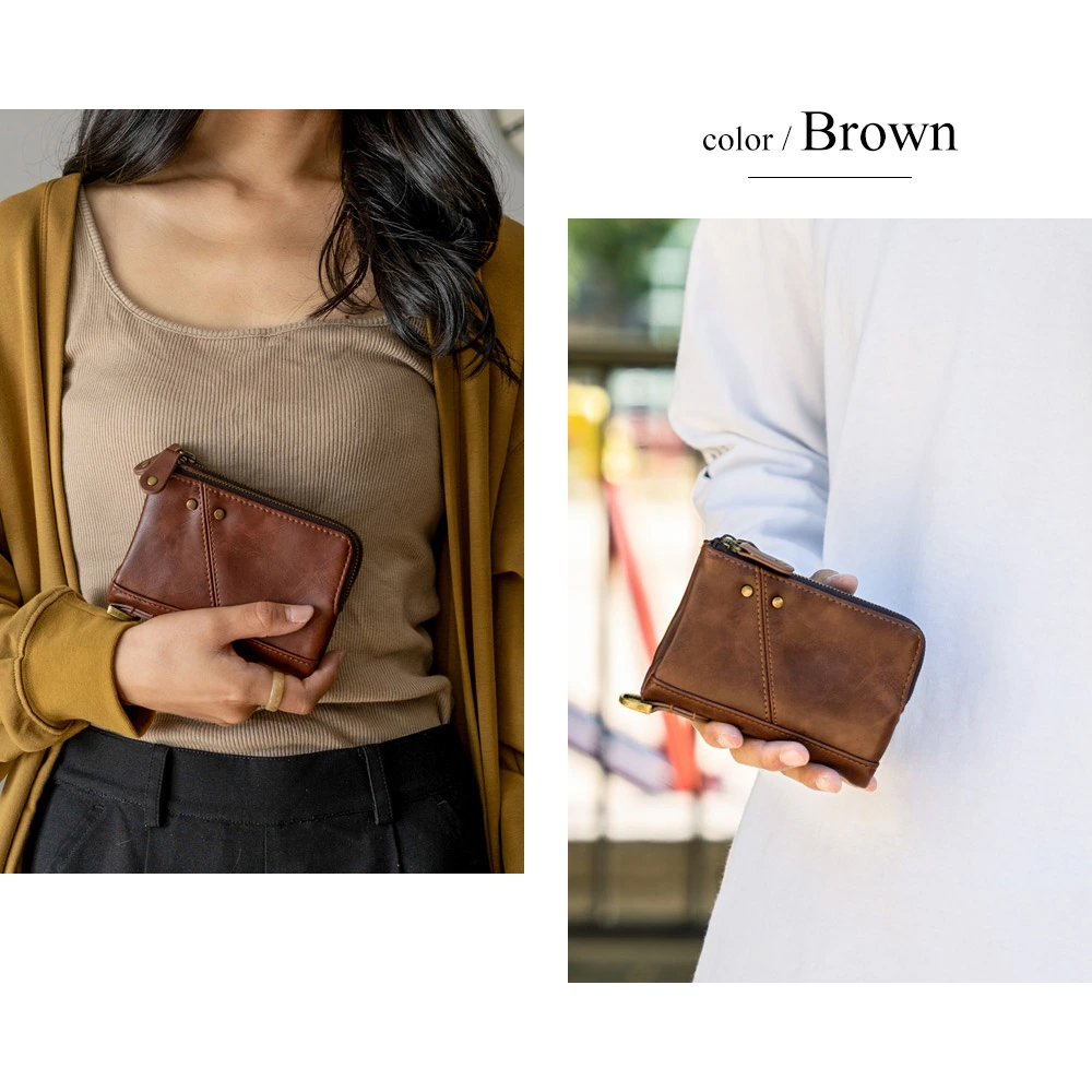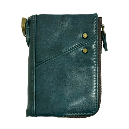 這款雙折皮夾透過整齊地縫線和裝飾鉚釘保持其簡約獨特性。