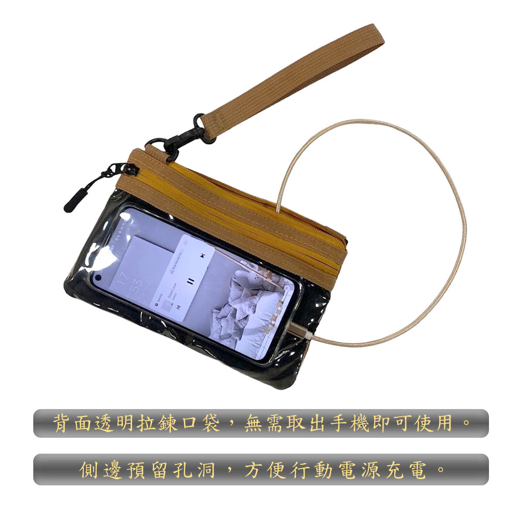 包包背面的透明拉鍊口袋,方便您無需取出手機即可輕鬆使用。