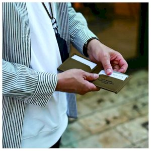 這款小巧纖薄的皮夾式包款採用一種名為織帶的聚酯纖維材料製成,