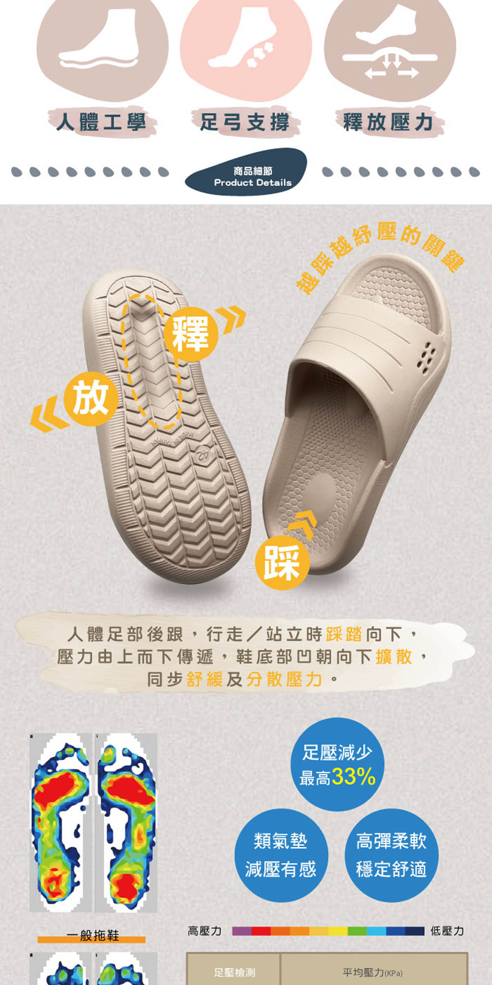 人體工學▶鞋頭微翹、後跟緩壓,符合足部曲線