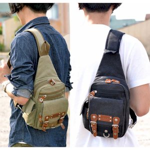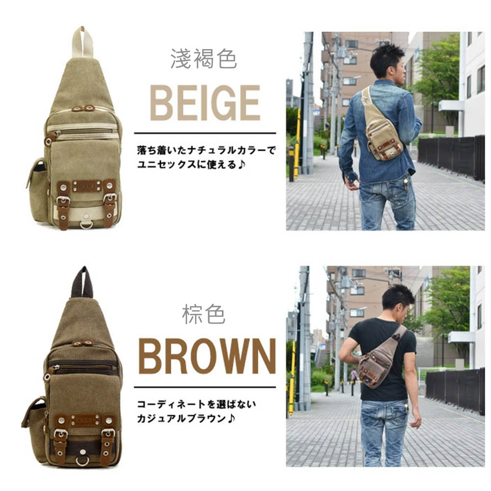 這款斜背包採用帆布布料,並經過獨特的化學水洗處理,呈現出做舊質感。