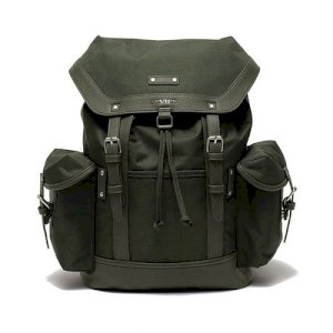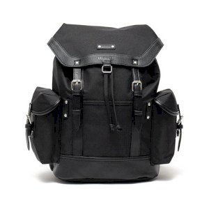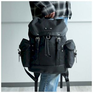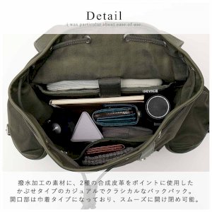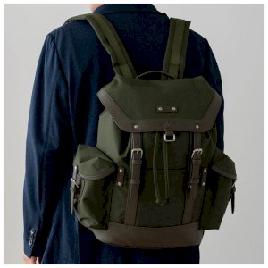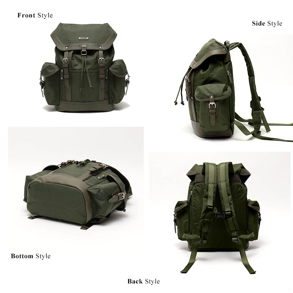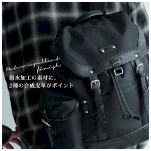 一款翻蓋式後背包,採用防潑水布料製成,並飾以兩種合成皮革。
