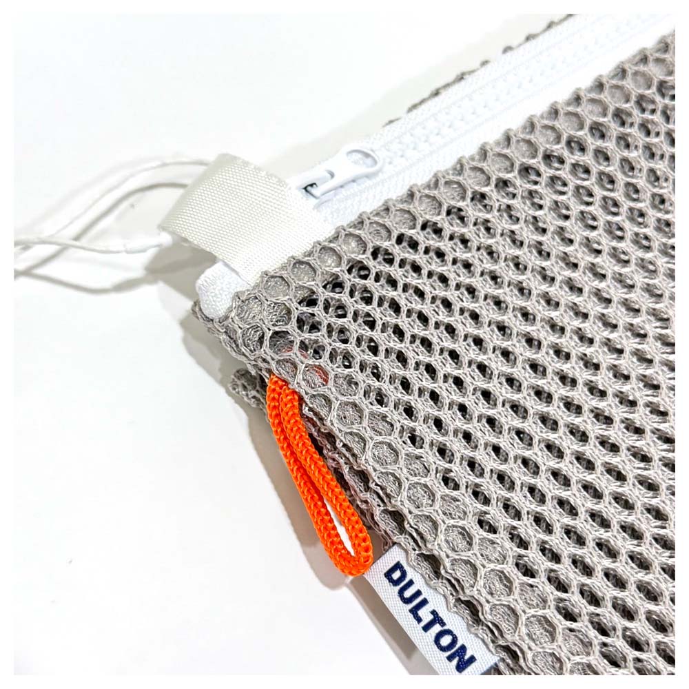 這款網袋採用柔和的灰色調和橙色掛環。
